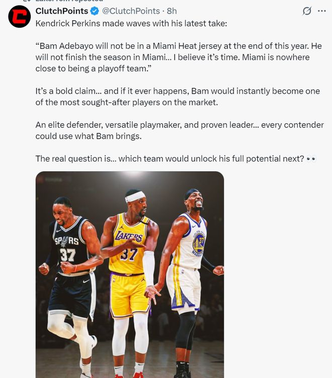 北京时间10月21日,NBA名人帕金斯在播客中谈到了热火队球员巴姆·阿德巴约的情况。他相信球迷不会看到热巴下赛季继续穿着热火球衣,因为热火距离季后赛越来越远。帕金斯表示:阿德巴约今年年底将不会继续穿着热火队的球衣打球。他将在本赛季结束前离开迈阿密。热火距离季后赛球队还很远。这是一个大胆的预测,如果这是真的,热巴将立即成为交易市场上最受欢迎的球员之一。他是一位出色的防守者、多才多艺的组织者和经验丰富的领导者。每一支想要竞争的球队都想交易他,那么哪支球队能够充分利用热火队的人才呢?事实上,10月4日,美国媒体报道称,夏洛特黄蜂队、金州勇士队、洛杉矶湖人队和圣安东尼奥马刺队都在关注巴姆·阿德巴约以及他在热火队的情况。 (热火媒体不想看到热巴离队)热巴目前合同还剩4年,25-26赛季身价3709万,并将在2026年夏天开始领取1.61亿的三年顶薪。也就是说,1.98亿还剩四年。上赛季他场均上场34.3分钟,得到18.1分9.6篮板4.3助攻1.26抢断0.68盖帽,投篮命中率为49%,三分球命中率为36%。阿德巴约是一名出色的后卫,也是球队的主力。他可以打4-5号位。湖人博主看到这个消息非常高兴。相信这是湖人组建四巨头的最好机会。如果湖人能够交易阿德巴约,他们必将成为新时代、甚至西部总冠军的有力争夺者。湖人媒体 NBA 湖人队报道了交易阿德巴约的计划。这个计划是4换1,湖人队将送出8寸大垒、克内克特、文森特、以及2031年的首轮选秀权(潜在的前三顺位)。成为说实话,这个计划很顺利。如果黄蜂和马刺想要拿下雷巴,湖人就没有筹码了。